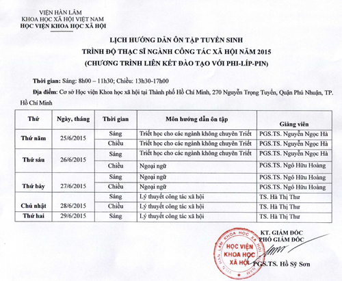 Lịch hướng dẫn ôn tập tuyển sinh trình độ Thạc sĩ ngành Công tác xã hội năm 2015 (Chương trình liên kết với Philippin)