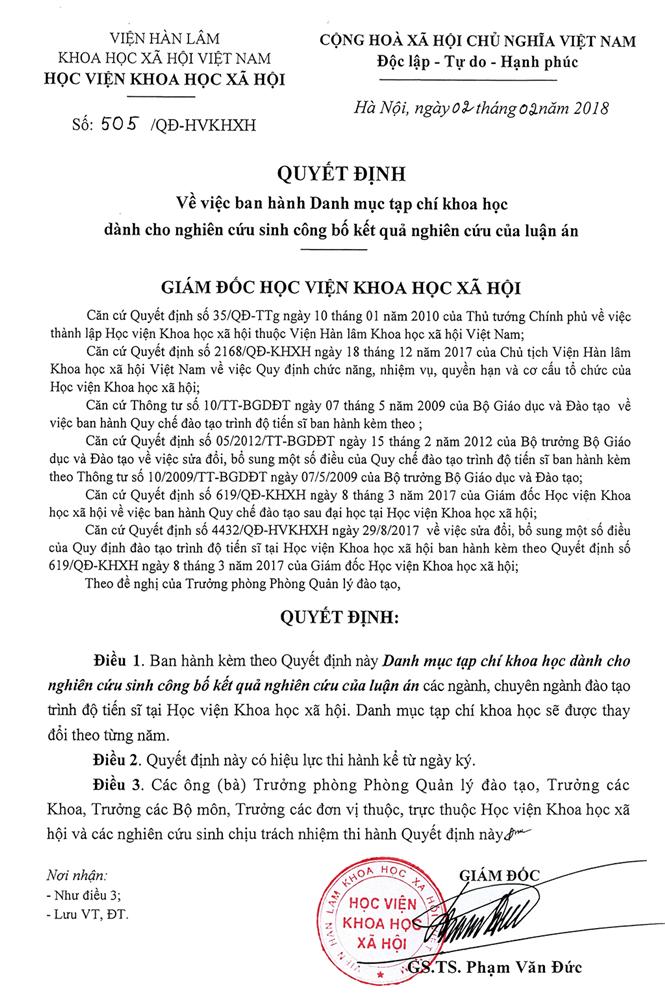Quyết định Ban hành danh mục tạp chí khoa học dành cho Nghiên cứu sinh công bố kết quả nghiên cứu của luận án