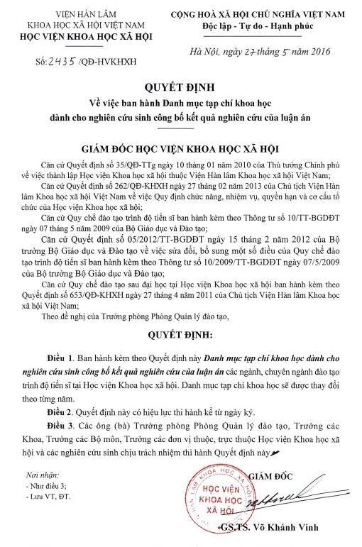 Quyết định về việc ban hành danh mục tạp chí khoa học dành cho nghiên cứu sinh công bố kết quả nghiên cứu của luận án