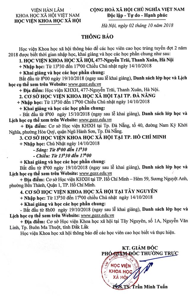 Thông báo thời gian nhập học, khai giảng và học các học phần chung của học viên cao học trúng tuyển đợt 2 năm 2018