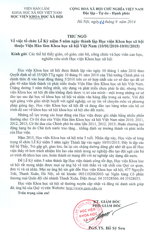 Thư ngỏ về việc tổ chức lễ kỷ niệm 5 năm ngày thành lập Học viện Khoa học xã hội