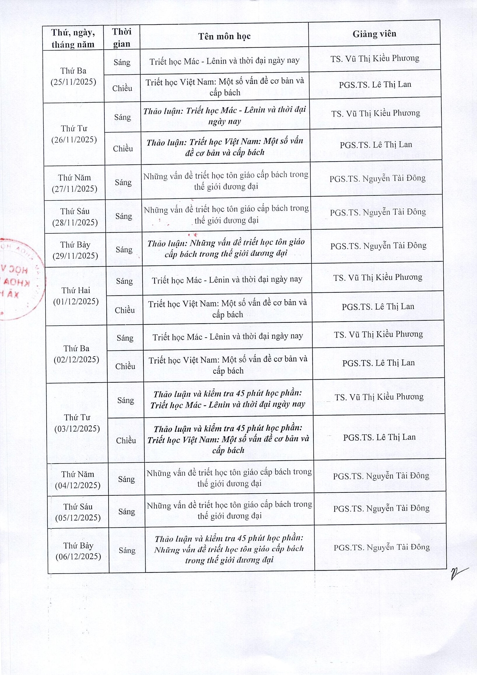 Lịch học dành cho Nghiên cứu sinh ngành Triết học năm 2025