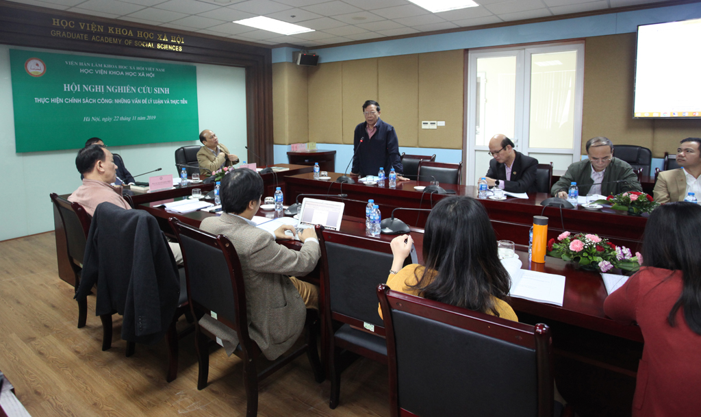 Tiếp đó, Hội nghị lần lượt nghe báo cáo của các nhà khoa học tập trung vào các vấn đề lý luận và thực tiễn thực hiện chính sách công ở Việt Nam giai đoạn hiện nay; báo cáo của các nghiên cứu sinh về kết quả, tình hình nghiên cứu, tiến độ thực hiện luận án. Trên quan điểm thẳng thắn, cởi mở; các nhà khoa học đã lắng nghe những chia sẻ từ phía nghiên cứu sinh và gợi mở những định hướng nghiên cứu. Ngoài những kết quả các NCS đã đạt được trong thời điểm hiện tại, các ý kiến thảo luận của chỉ ra một số điểm tồn tại như: Cách tiếp cận nghiên cứu; xác định vấn đề và việc vận dụng các khái niệm, các phương pháp trong nghiên cứu ở một số đề tài chưa sát với trọng tâm nghiên cứu… Trước những mặt hạn chế này, Hội nghị đã tiếp thu nhiều ý kiến đóng góp quý báu của các nhà khoa học đối với mỗi bản báo cáo; thống nhất về việc cần nâng cao ý thức trách nhiệm từ phía các nghiên cứu sinh và giáo viên hướng dẫn.