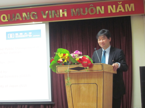 Hội thảo về Chính sách công và Quản lý công diễn ra trong hai ngày 26 và 27 tháng 11 năm 2013 có sự tham gia của các học giả tới từ Nhật Bản với những chủ đề như: “Đánh giá chính sách trong kinh tế học: Mô hình cân bằng tổng thể có thể tính toán được (CGE) và Phân tích chính sách công theo tình huống giả định” của GS. Ryuta Ray Kato, Phó Chủ tịch trường IUJ; “Phác thảo mô hình Quản lý công: Những điều đã biết và cần biết” của PGS. Sangyub Ryu, trường IUJ và “Quản lý công tại Nhật Bản” của PGS. Kyohei Yamada. Về phía học giả Việt Nam, TS. Đỗ Phú Hải – Phó Trưởng khoa Khoa Chính sách công, Học viện KHXH đã trình bày tham luận “Cải cách Hành chính công ở Việt Nam”. Tất cả những bài tham luận đều là những công trình nghiên cứu chuyên sâu và cập nhật những thông tin mới nhất về Chính sách công và Quản lý công dưới góc độ đa ngành và liên ngành như chính trị, kinh tế, luật học. Các bài tham luận đã gợi mở và chia sẻ nhiều bài học kinh nghiệm cho Việt Nam trong việc nỗ lực quản lý “nhằm tận dụng tối đa các điều kiện môi trường và hạn chế các tác động tiêu cực của môi trường tới hiêu quả sản xuất” như trong bài tham luận của PGS. Sangyrub Ryu về Phác thảo về mô hình quản lý công hay xây dựng các mô hình mang tính định lượng có thể tính toán được để đánh giá các chính sách trong kinh tế học của GS. Ryuta Ray Kato…