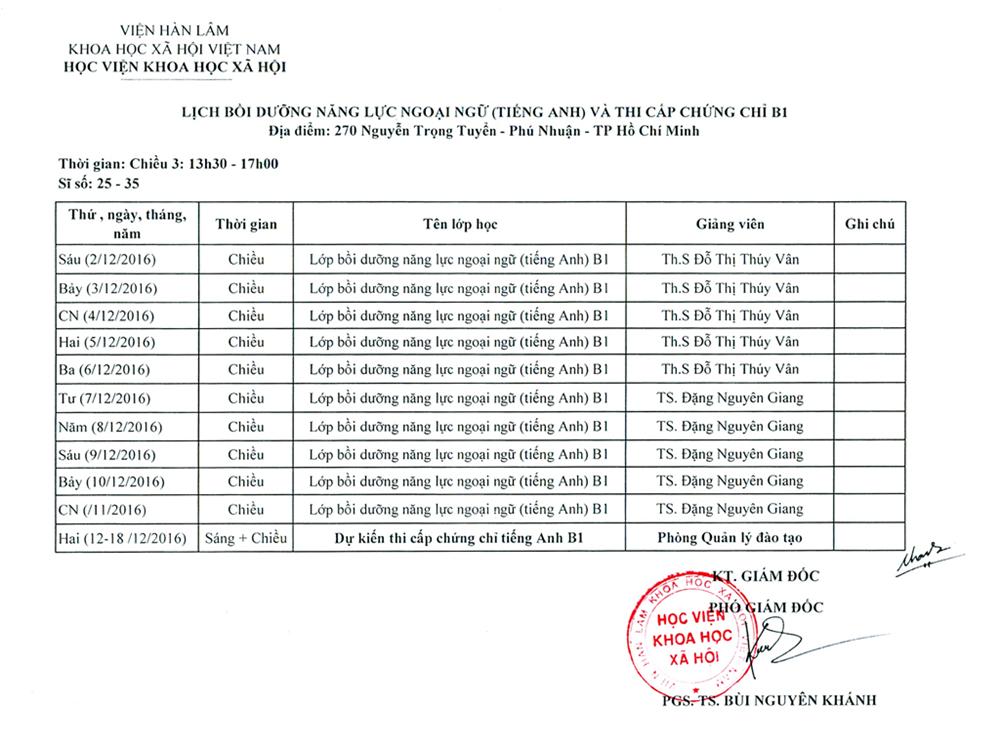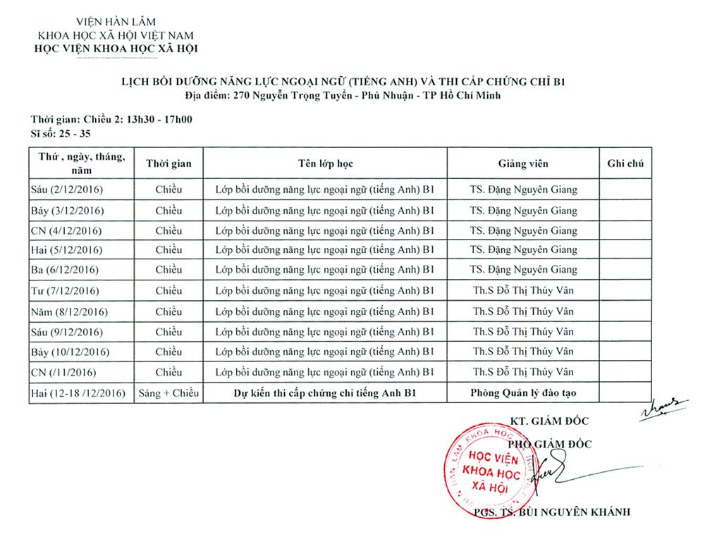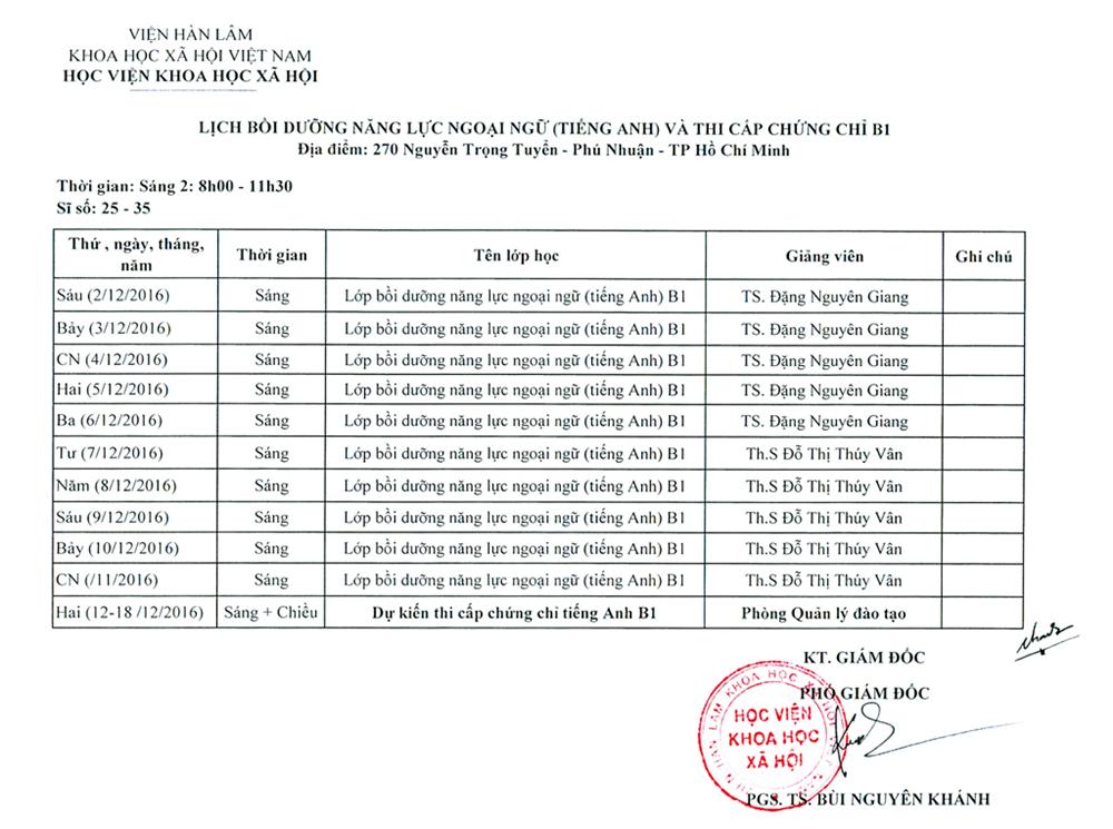 Lịch học các lớp bồi dưỡng năng lực ngoại ngữ (tiếng Anh) và thi cấp chứng chỉ B1 tại thành phố Hồ Chí Minh