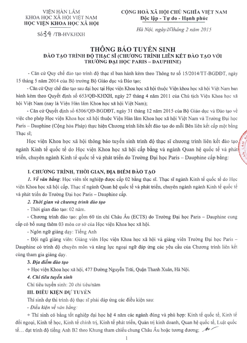 Thông báo tuyển sinh trình độ Thạc sĩ (chương trình liên kết đào tạo với trường đại học Paris - Dauphine)